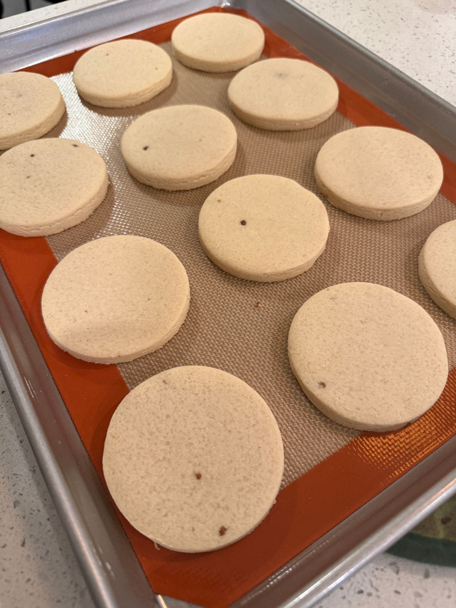 - Roll dough out to 5/16" inch using wood dowels as guides. Using a 3 to 3.5" cookie cutter, cut out cookies and place on silpat liners on cookie sheets. You should get about 18-20 cookies.