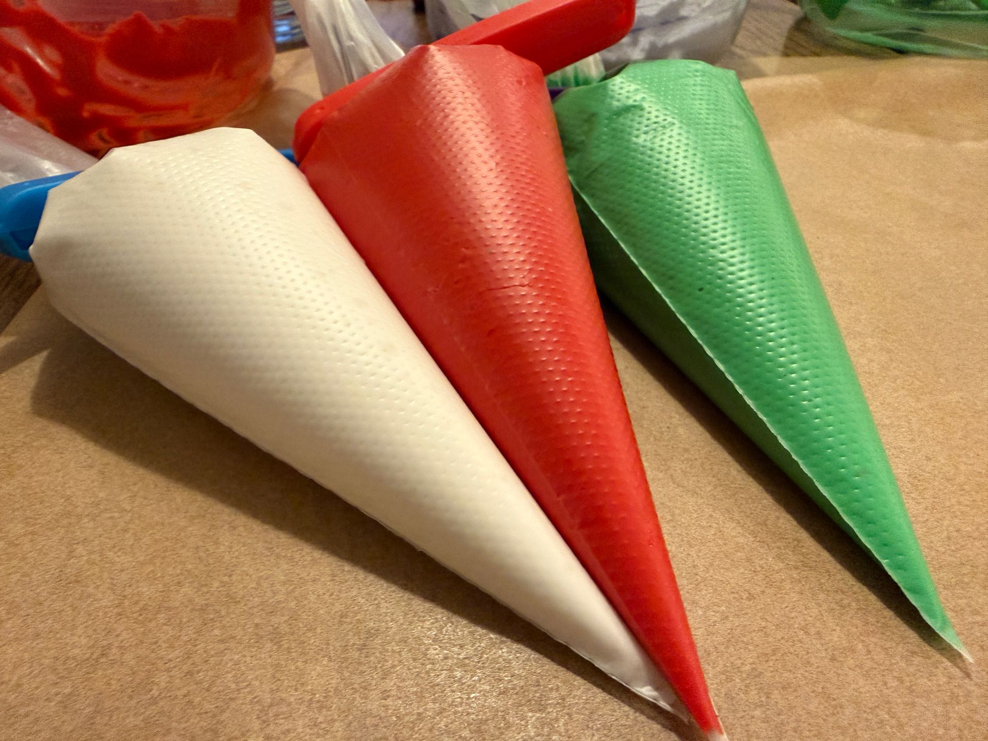 This is where patience kicks in. Once you've gotten to the extra thick flood consistency, use your gel colors and mix in the bowls. The colors used here are green, red, yellow, black. Make sure to have enough white on hand. You can include more colors for additional designs.