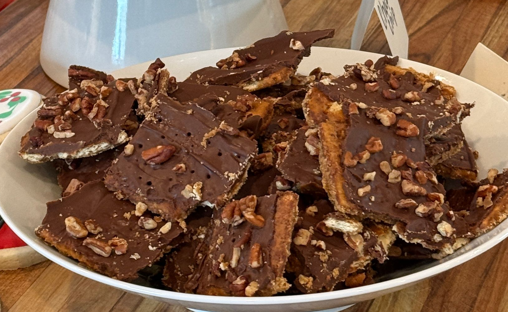 - Line a rimmed baking sheet with saltine crackers in single layer.