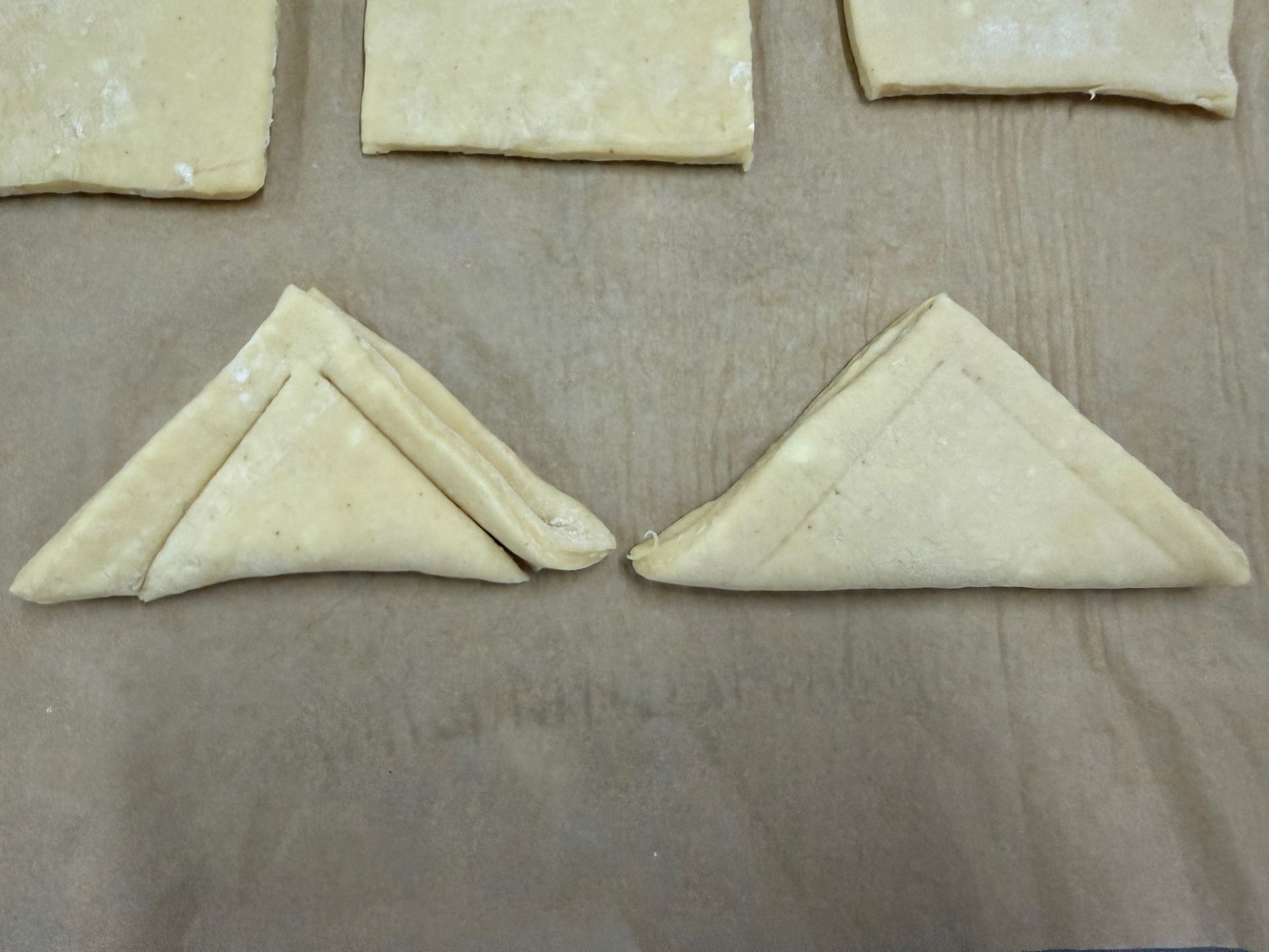 - Make cut lines about 1/2" on the dough from the top of the triangle toward each of the points, and then with bench scraper cut into dough making sure not to cut through the top.
