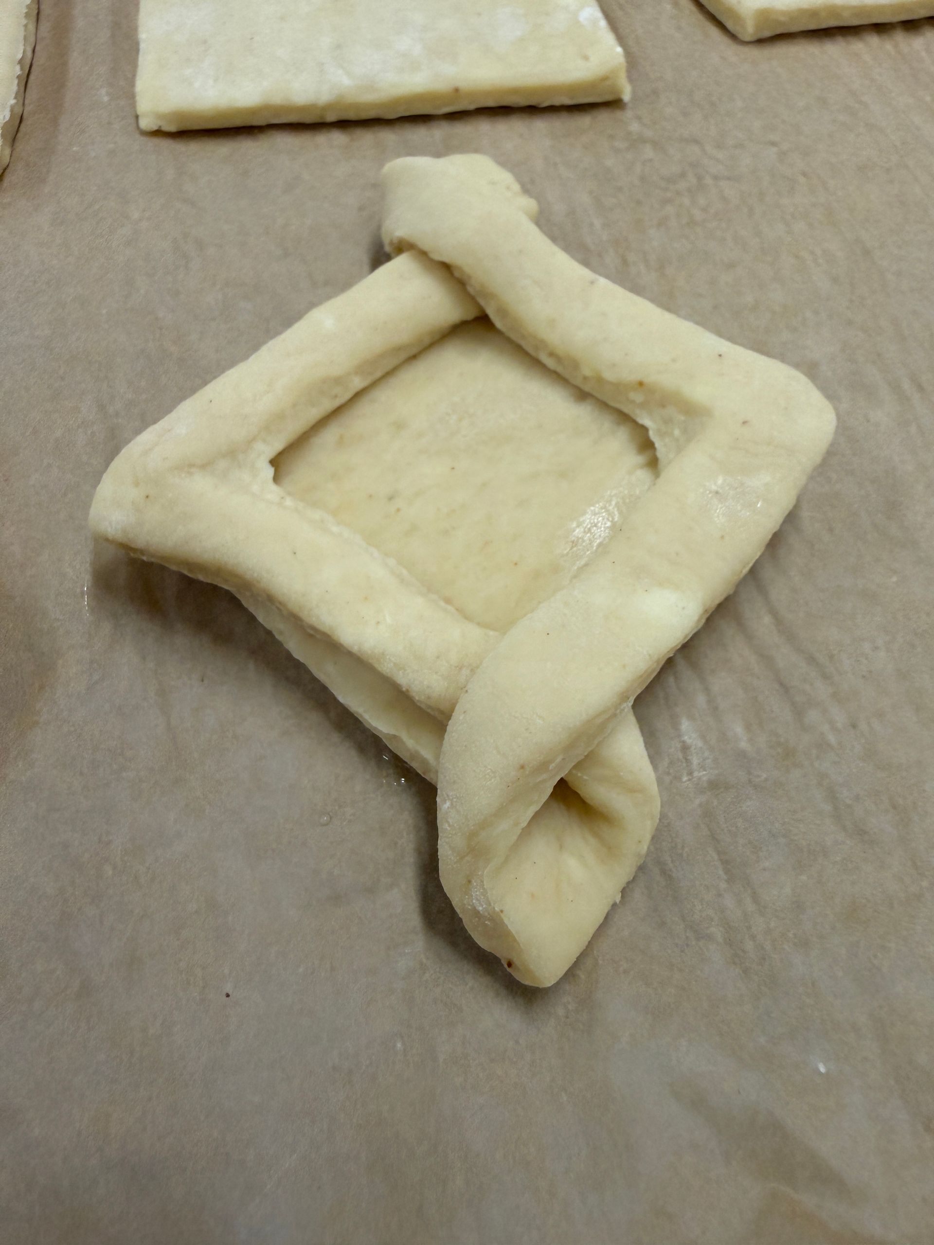 - Fold each cut strip to the opposite side to make a diamond-shaped pastry with a raised border all around. Press corners to seal